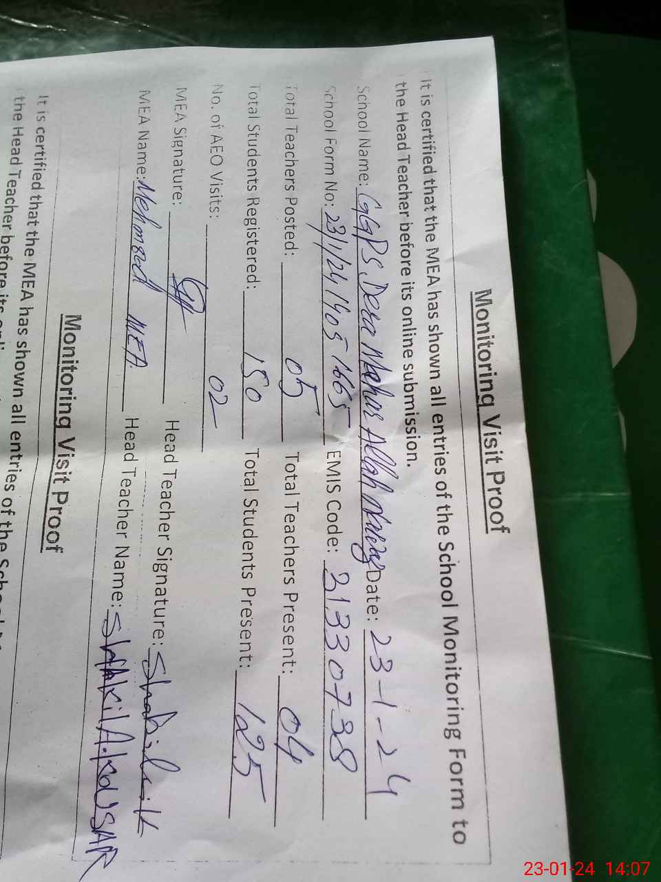 | Attendance Register | Head Teacher | MEA with School | Visit Proof |