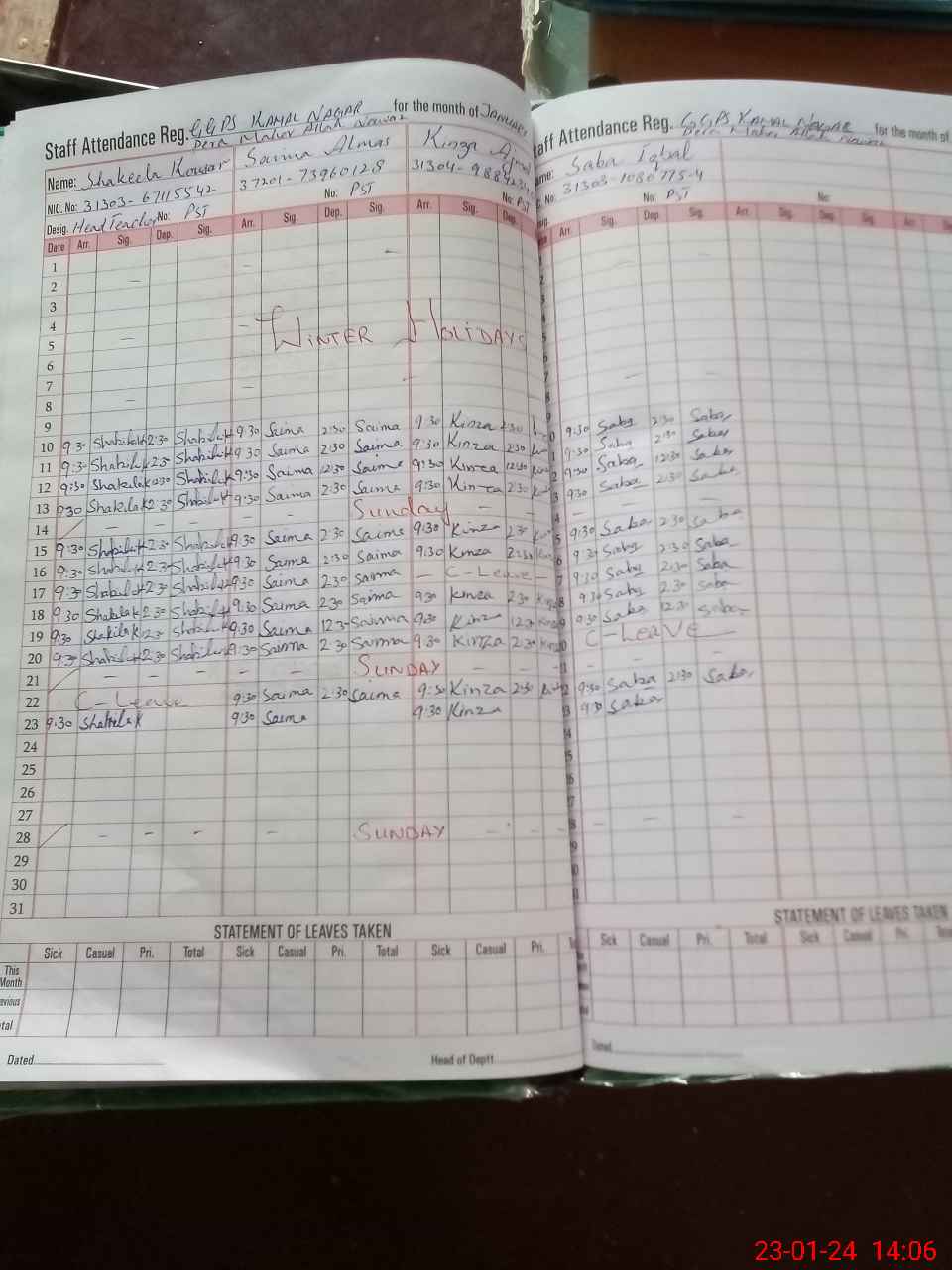 | CNIC | Full Name | Designation | R/C | Absence During Last Calender Month |