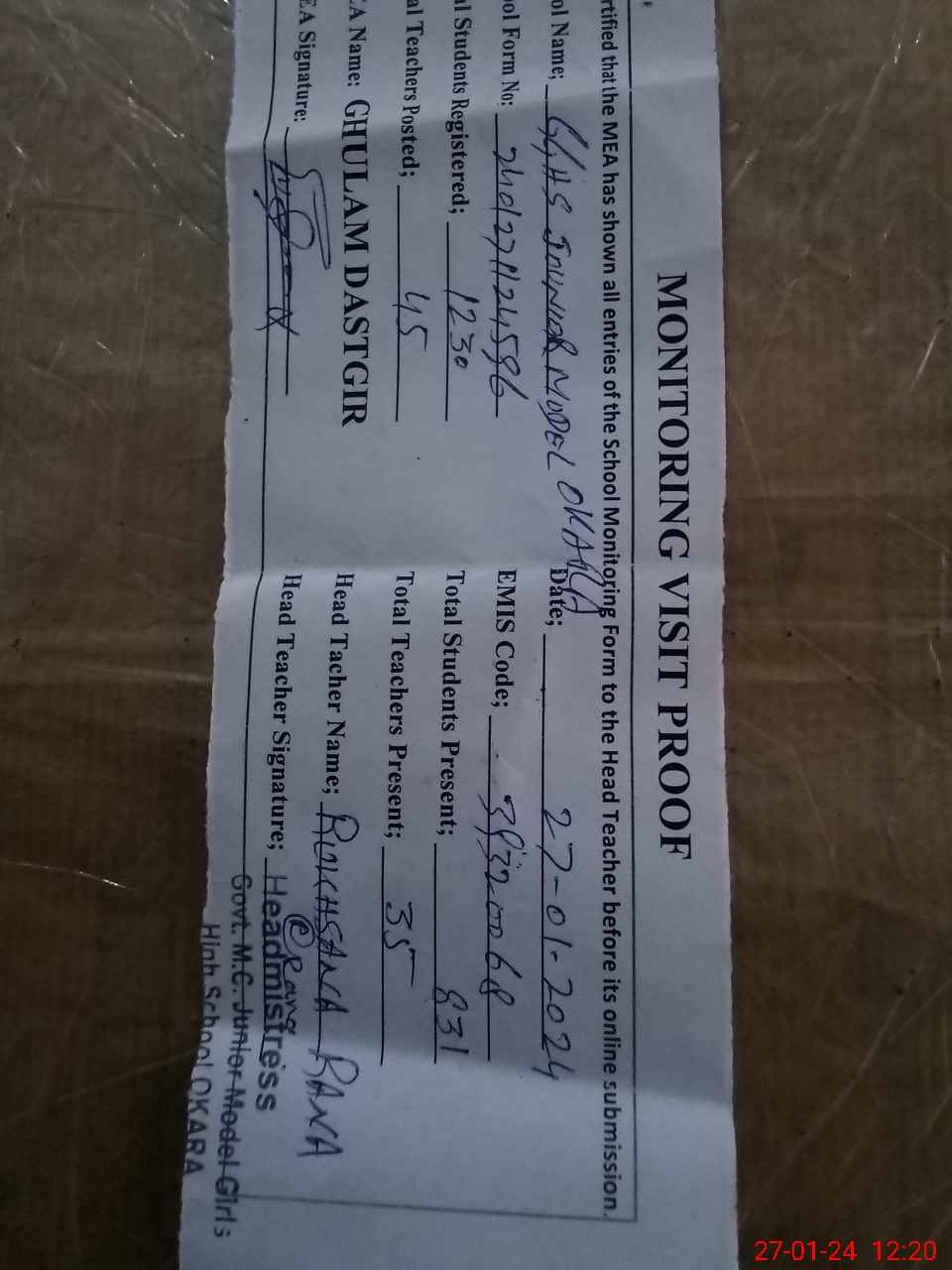 | EMIS Code: 39320068 | Name of School: GGHS MC JUNIOR MODEL OKARA | |||