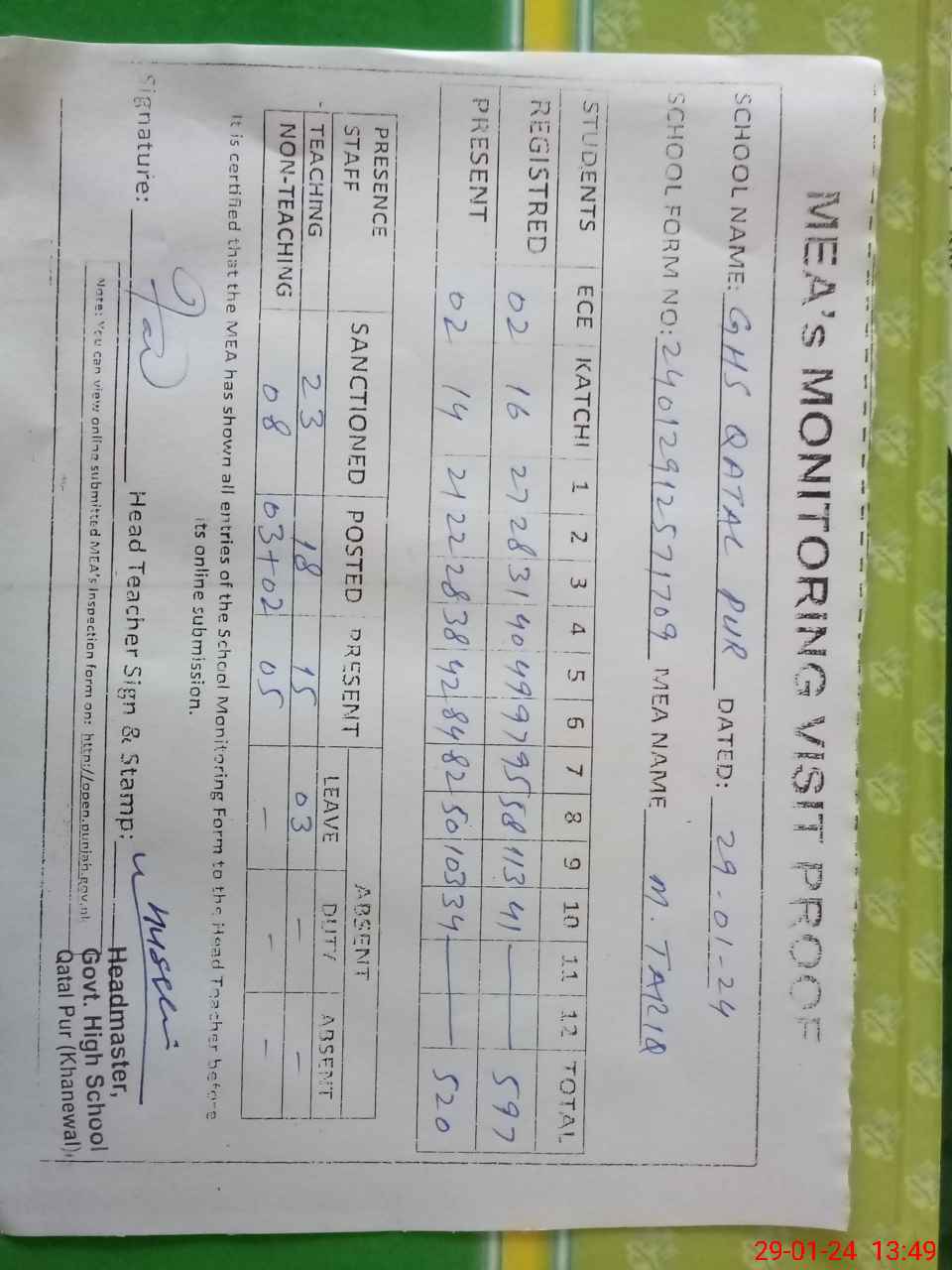 | EMIS Code: 36410020 | Name of School: GHS QATAL PUR, SARAI SIDHU | |||
