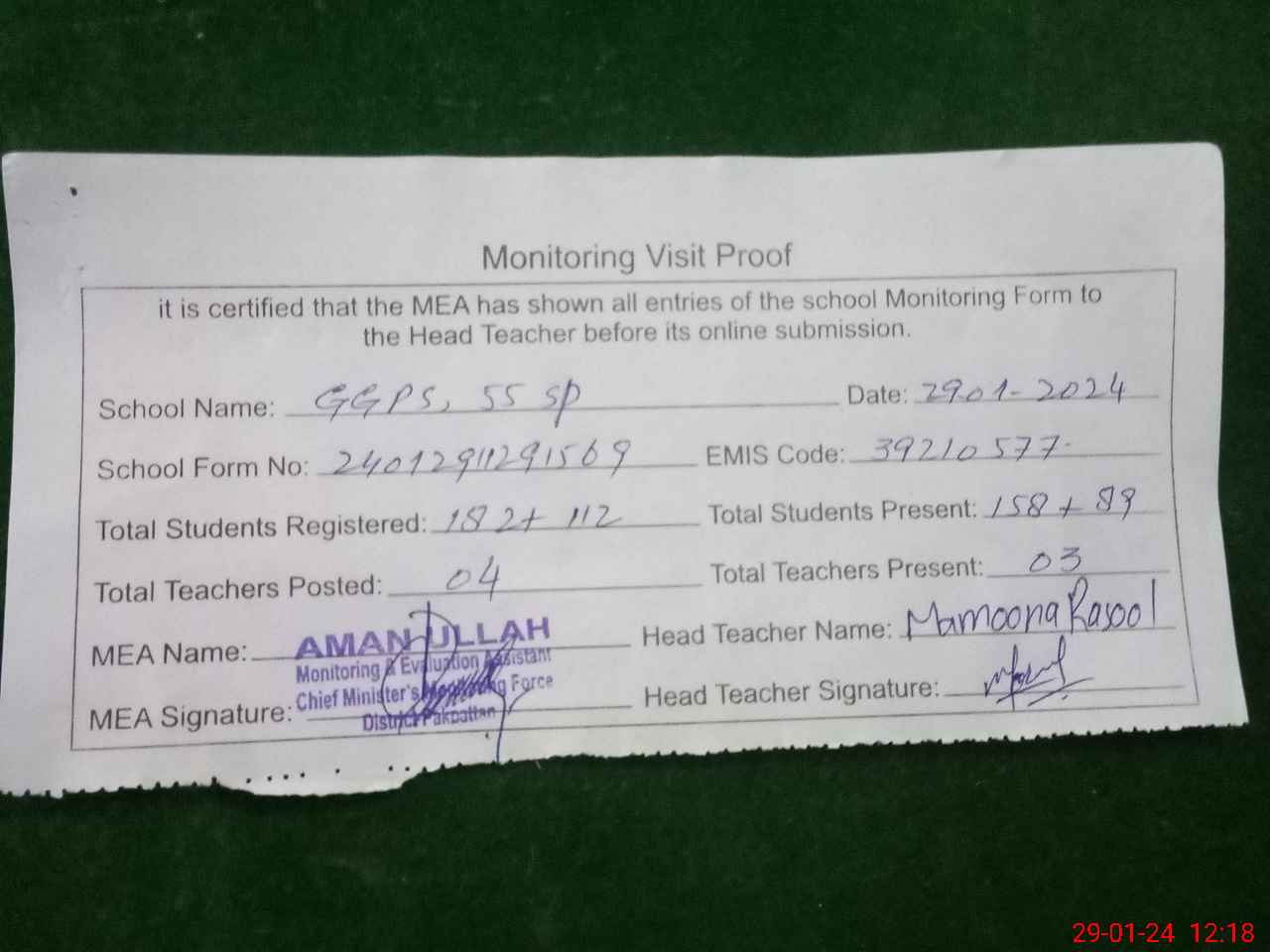 | EMIS Code: 39210577 | Name of School: Govt. Tufail Bibi Girls High School 55/SP | |||