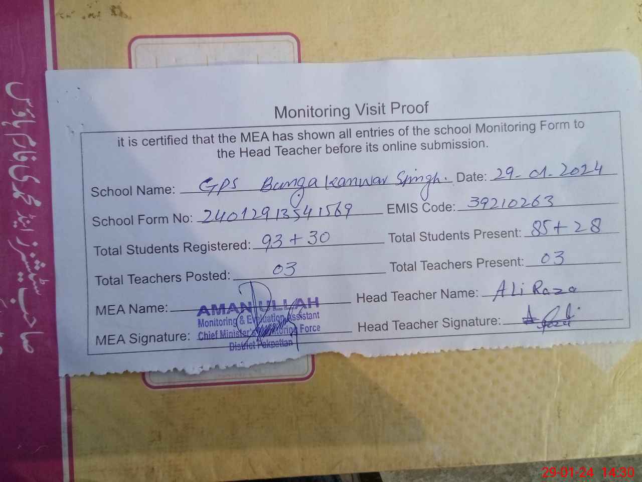 | Attendance Register | Head Teacher | MEA with School | Visit Proof |