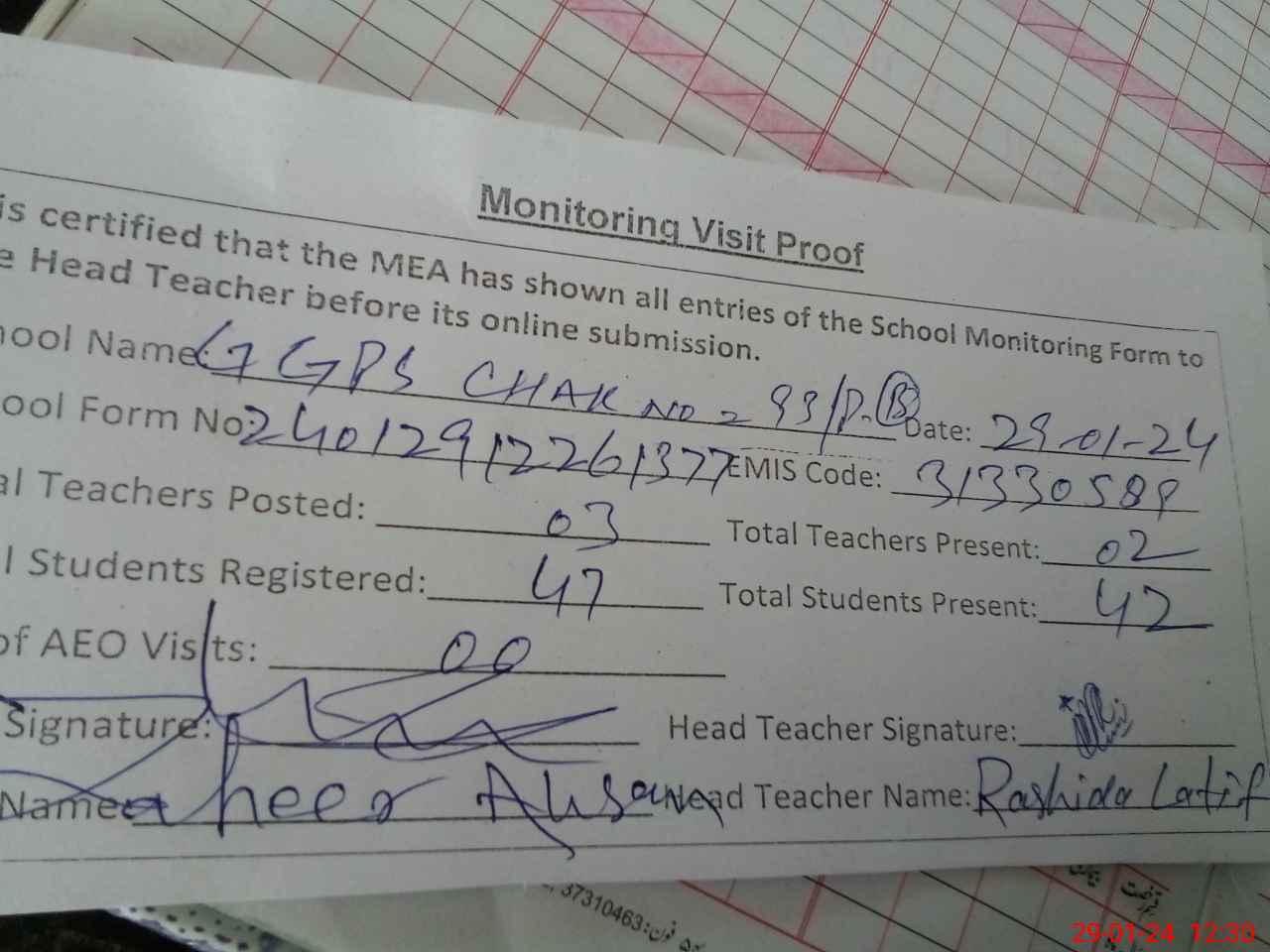 | Attendance Register | Head Teacher | MEA with School | Visit Proof |