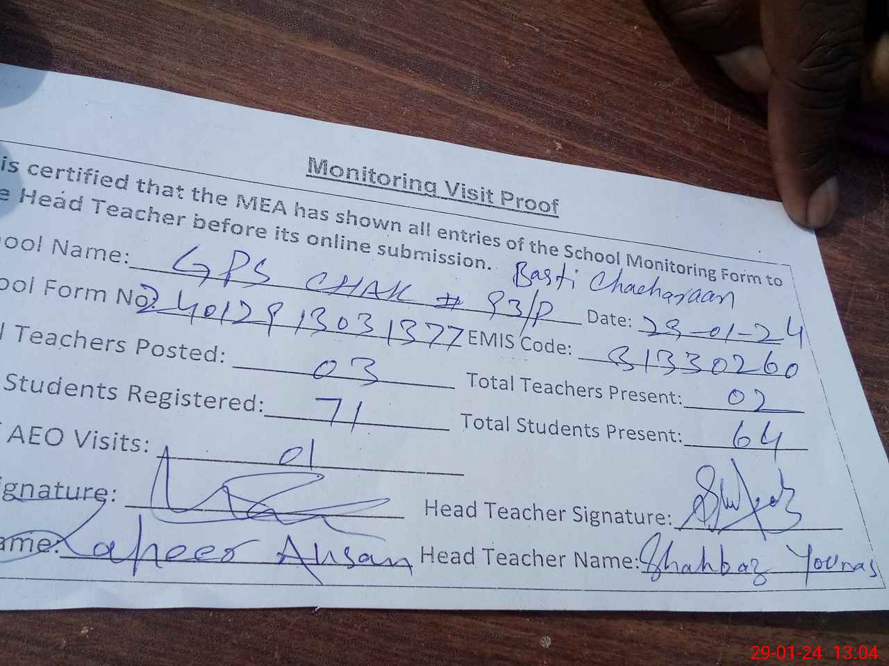 | Attendance Register | Head Teacher | MEA with School | Visit Proof |