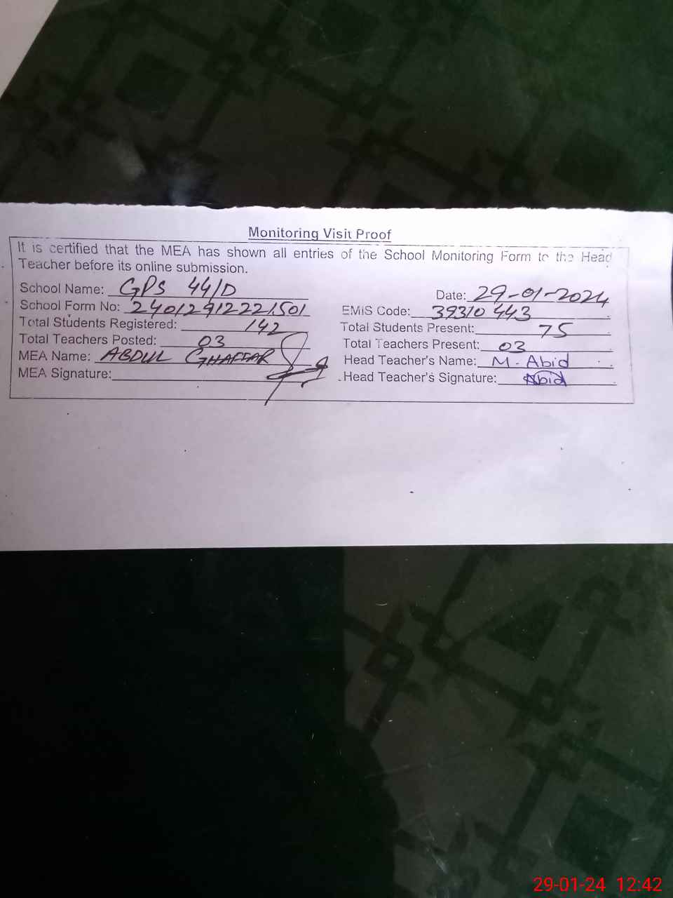 | Attendance Register | Head Teacher | MEA with School | Visit Proof |