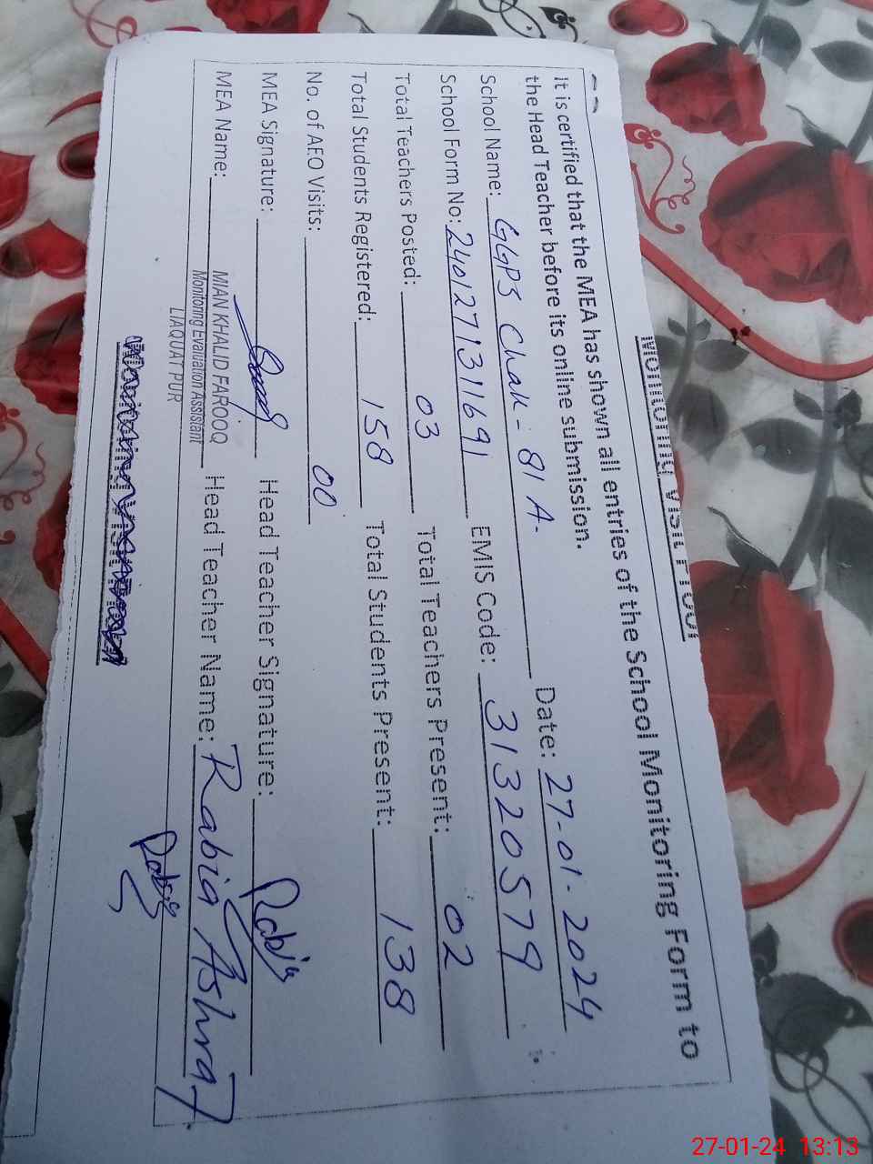 | Attendance Register | Head Teacher | MEA with School | Visit Proof |