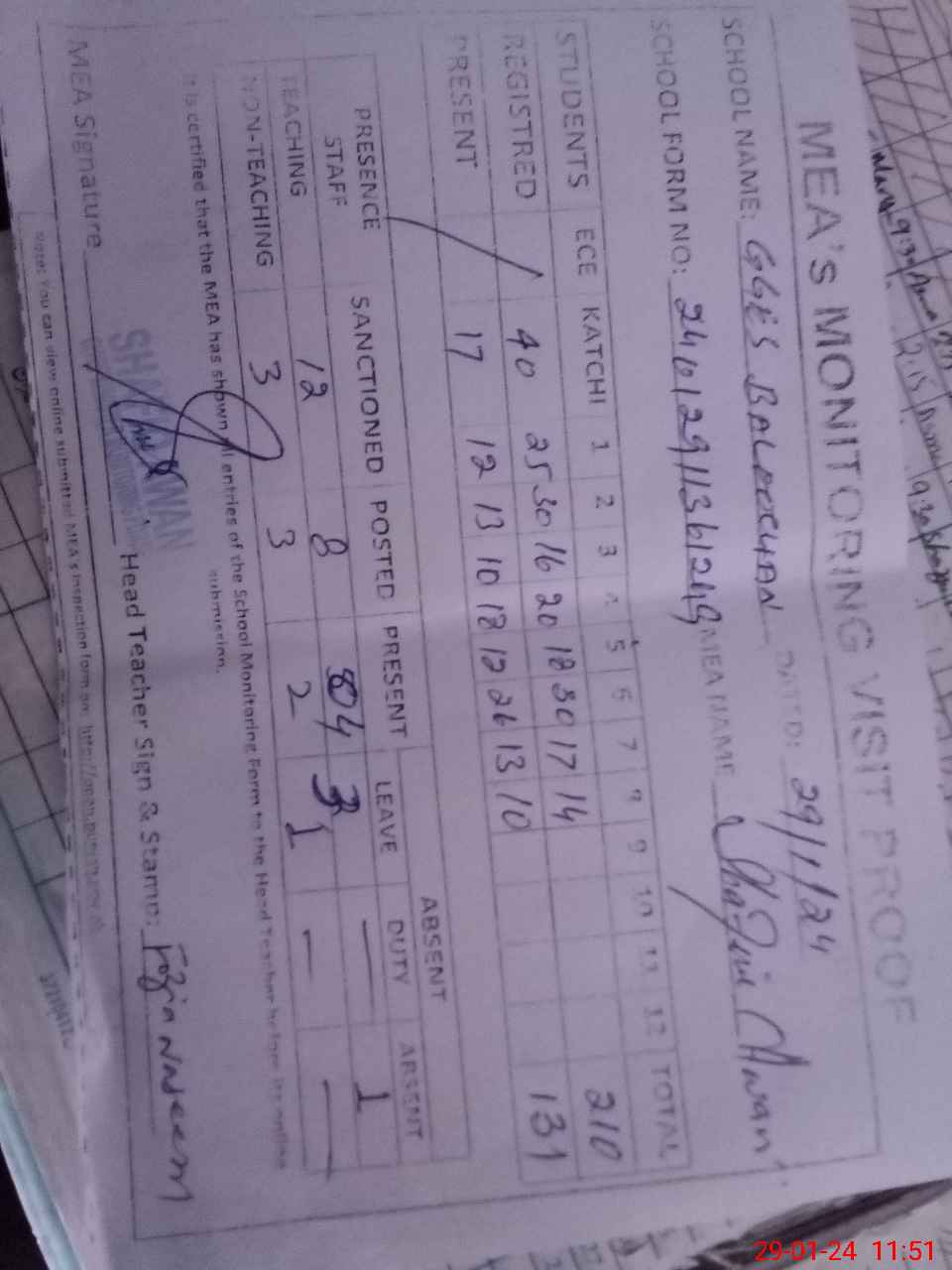 | Monitoring Date: 29-01-2024 | Start Time: 29-01-2024 10:29 AM | End Time: 29-01-2024 11:55 AM | Name of MEA: SH**** AH**** | |