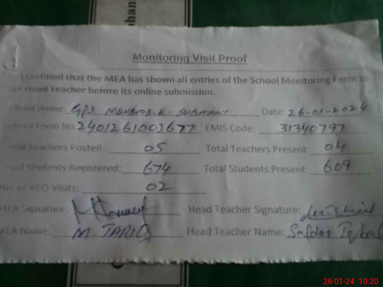 | Attendance Register | Head Teacher | MEA with School | Visit Proof |
