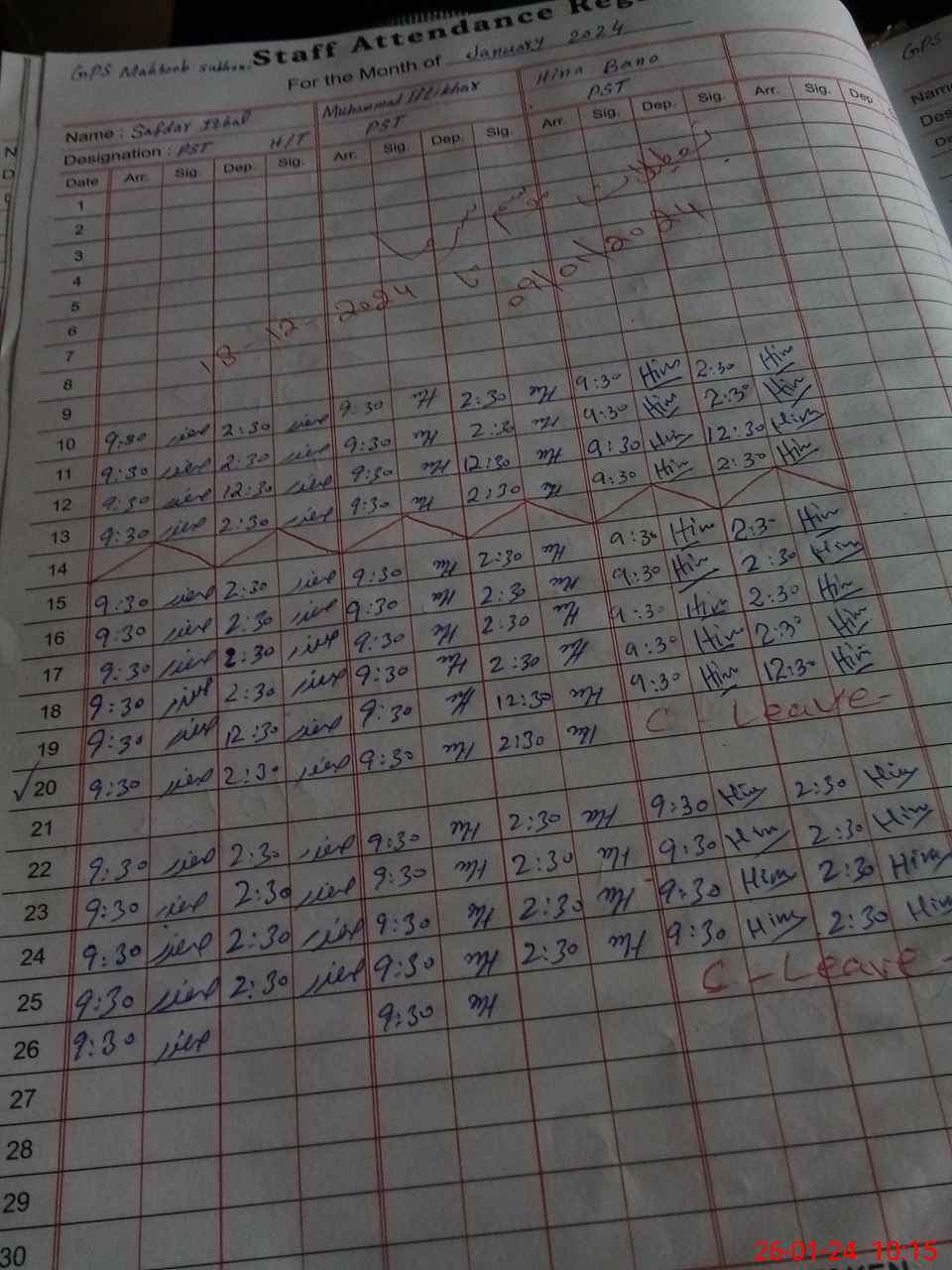 | CNIC | Full Name | Designation | R/C | Absence during last cal. month |