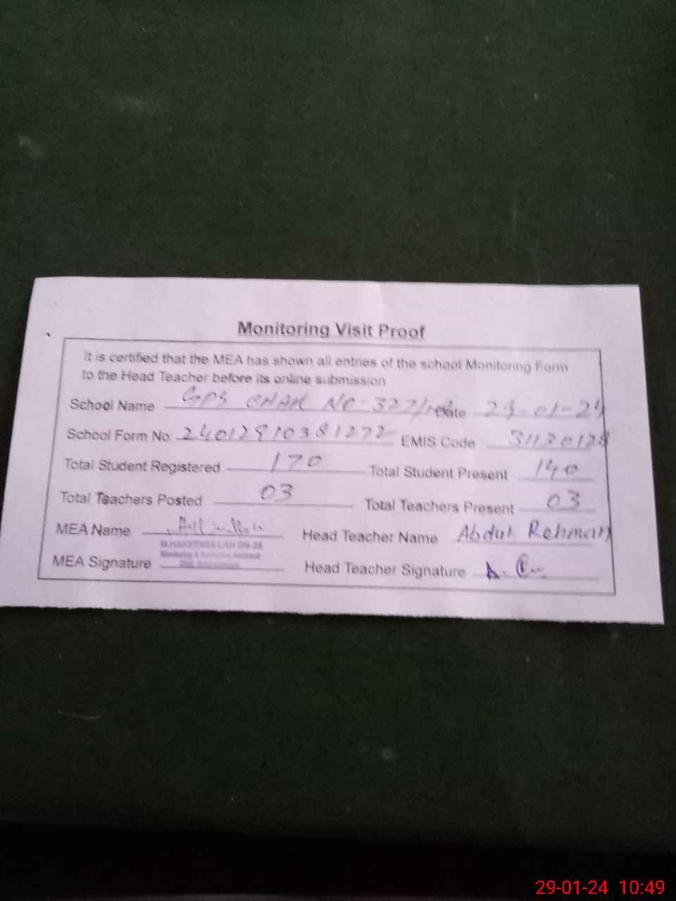 | Attendance Register | Head Teacher | MEA with School | Visit Proof |