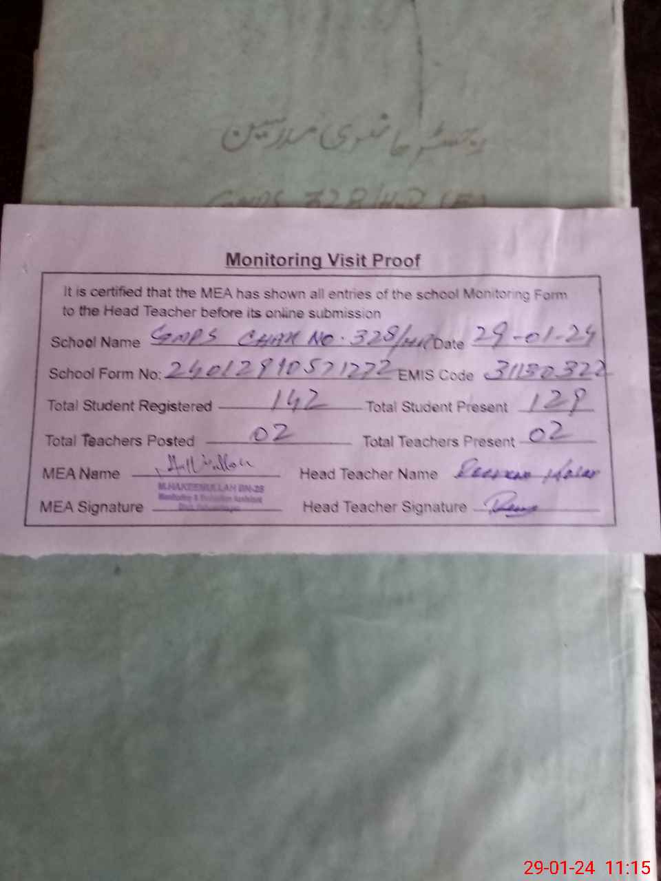 | Attendance Register | Head Teacher | MEA with School | Visit Proof |