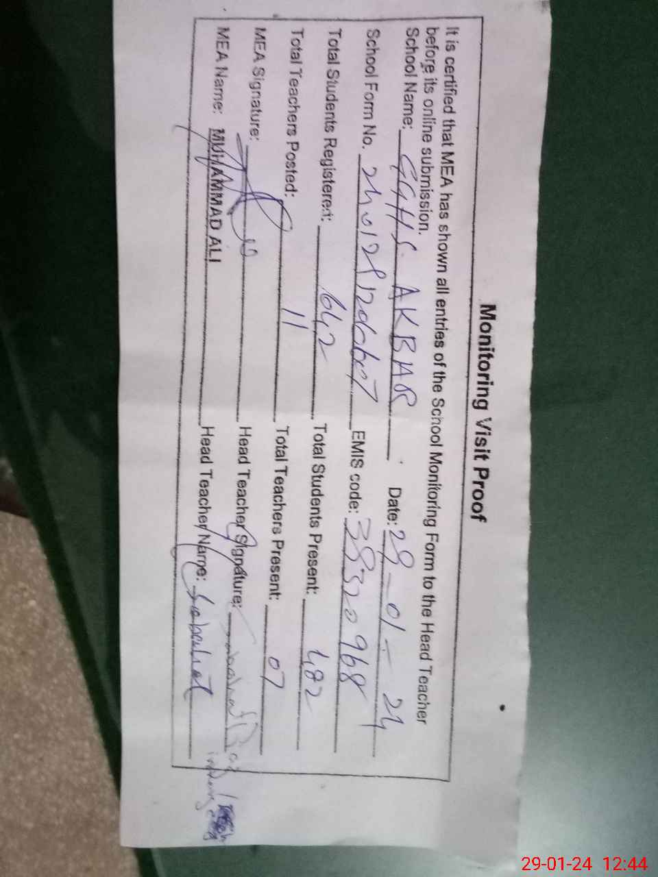 | Attendance Register | Head Teacher | MEA with School | Visit Proof |
