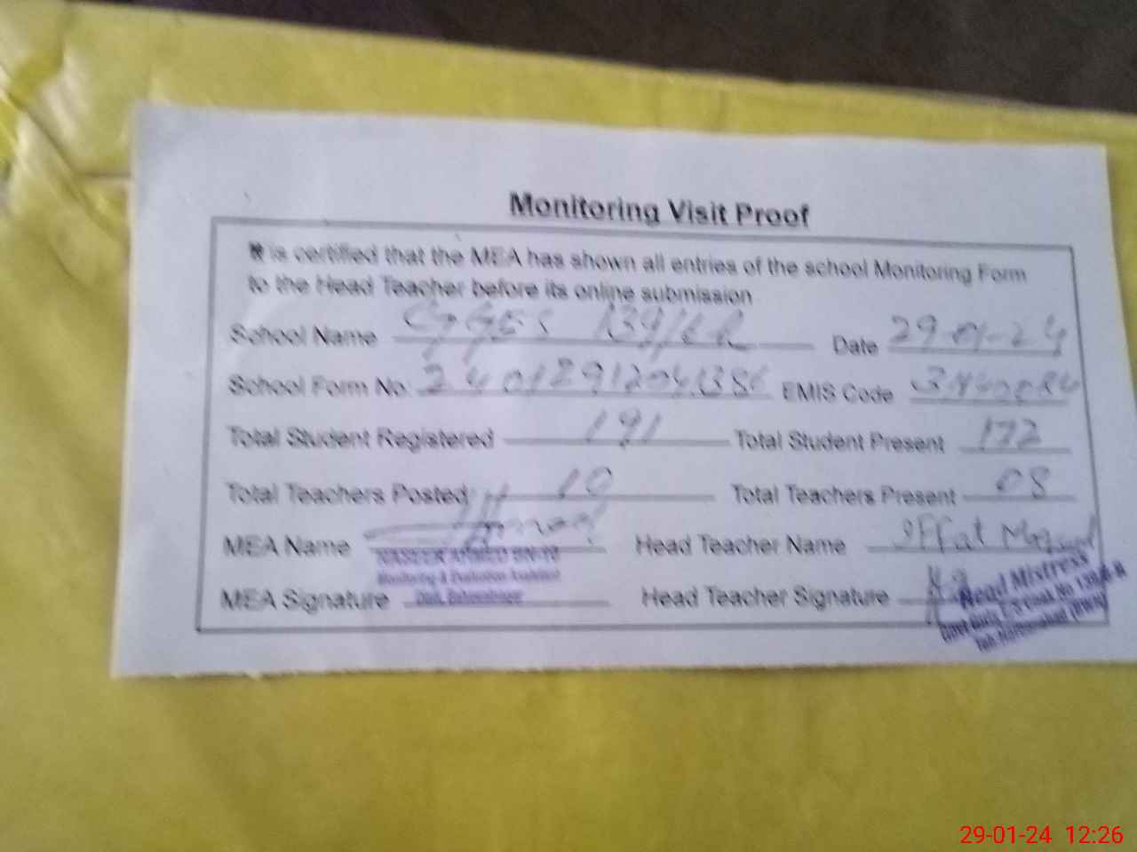 | Attendance Register | Head Teacher | MEA with School | Visit Proof |