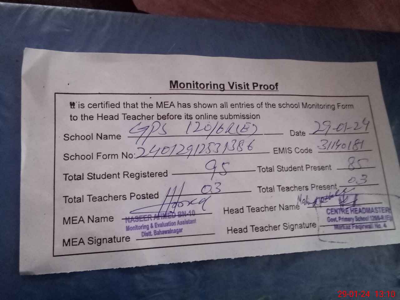 | Attendance Register | Head Teacher | MEA with School | Visit Proof |