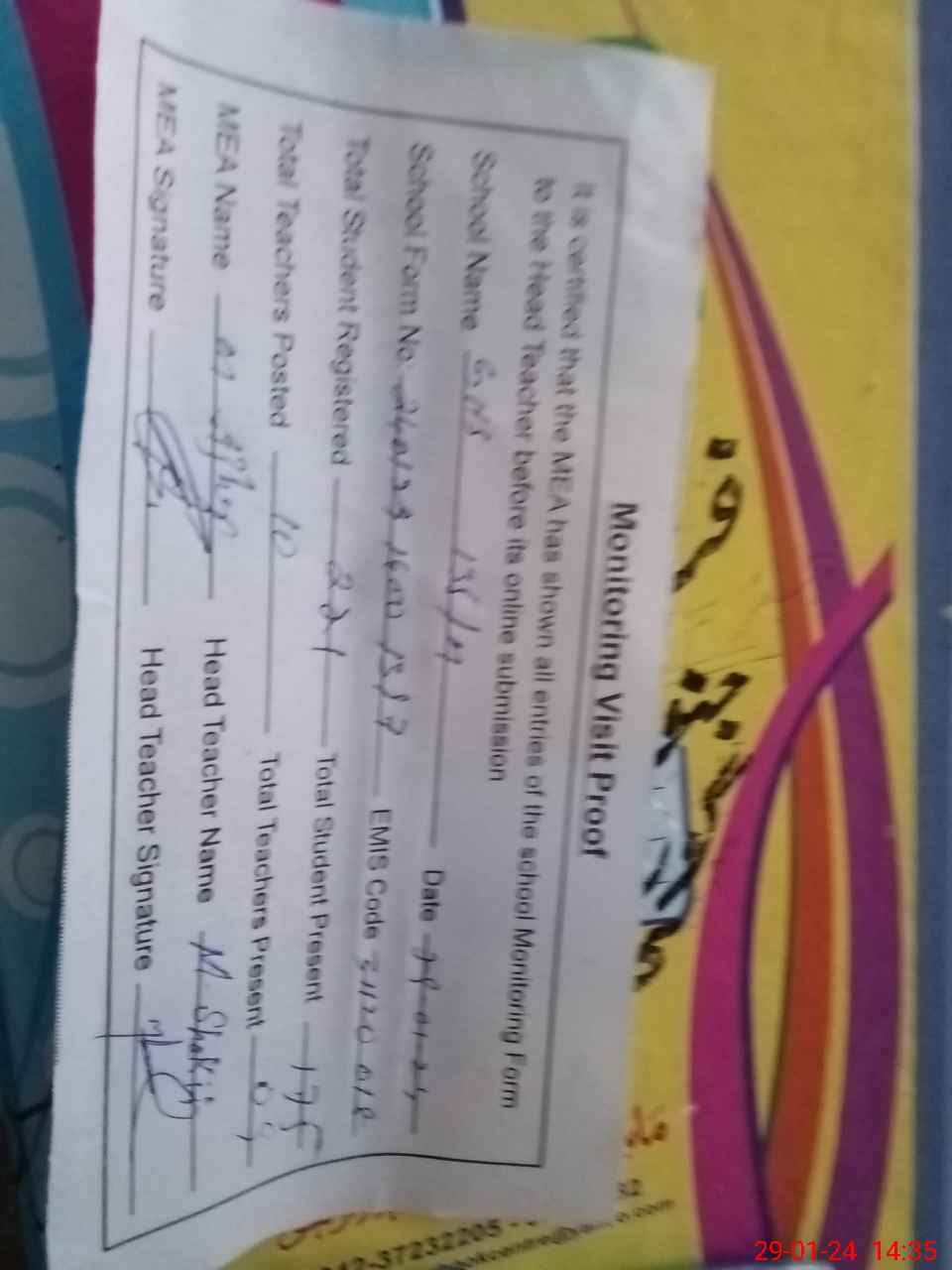| Attendance Register | Head Teacher | MEA with School | Visit Proof |