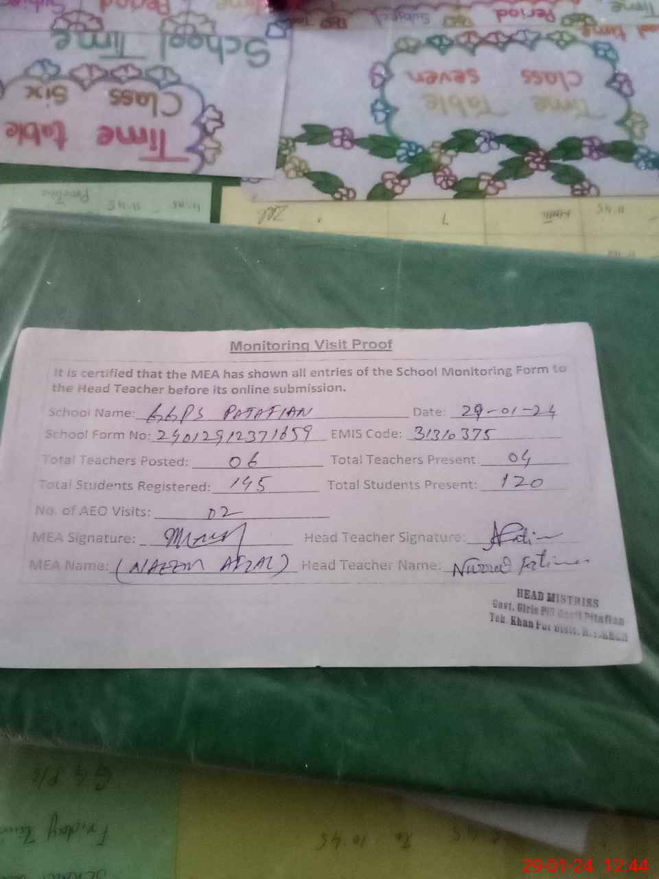 | Attendance Register | Head Teacher | MEA with School | Visit Proof |