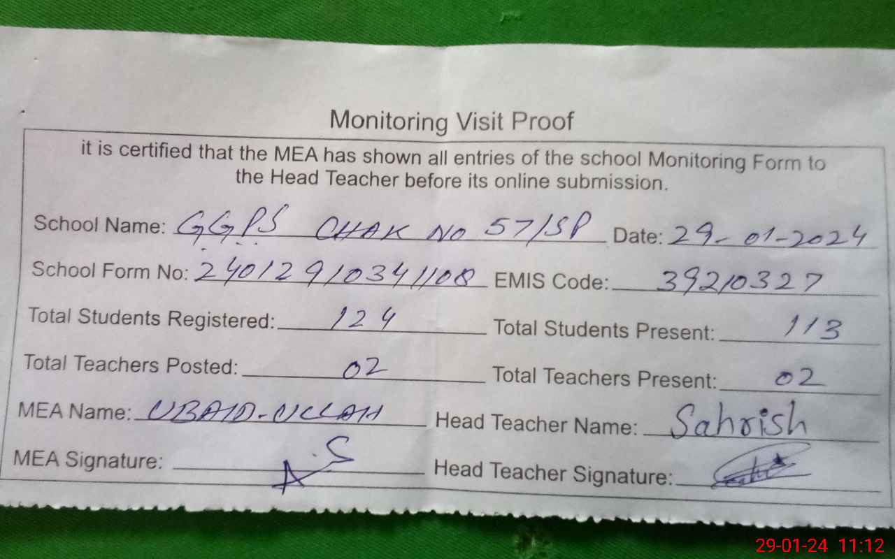 | Attendance Register | Head Teacher | MEA with School | Visit Proof |