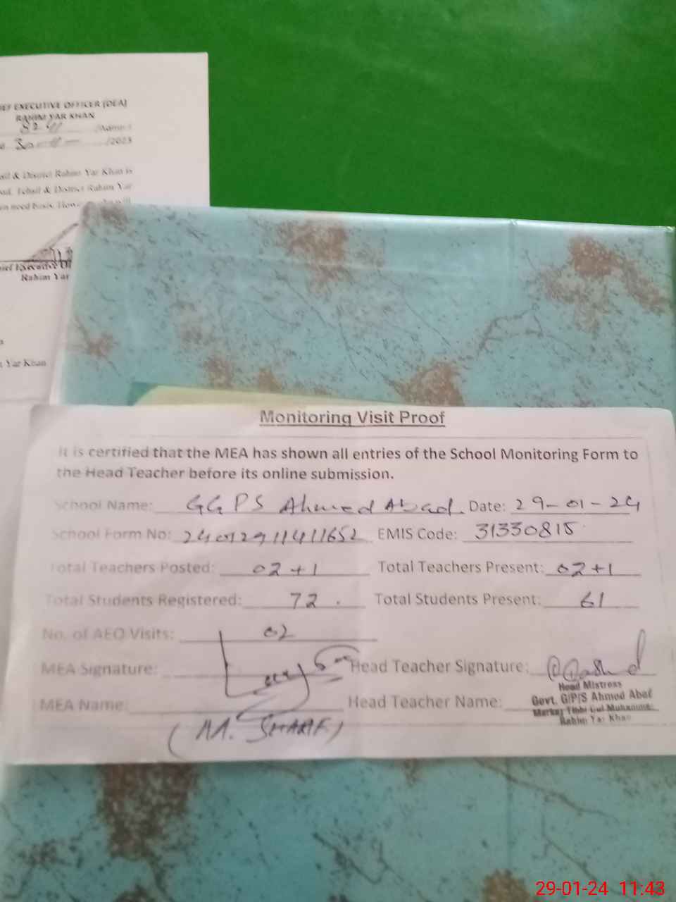 | Attendance Register | Head Teacher | MEA with School | Visit Proof |