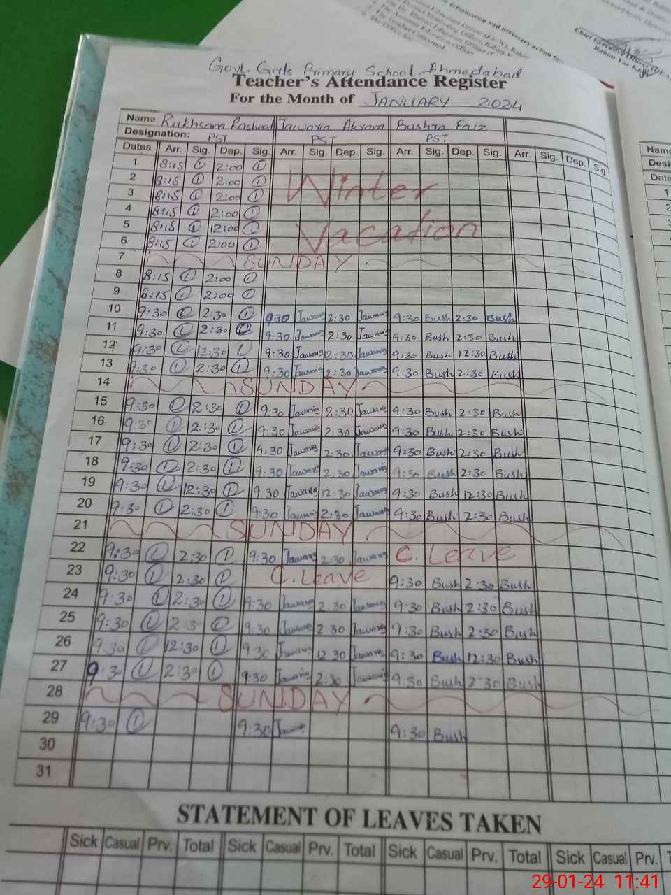 | Leave | Duty | Absent | Maternity | Medical | Ex- Pak |