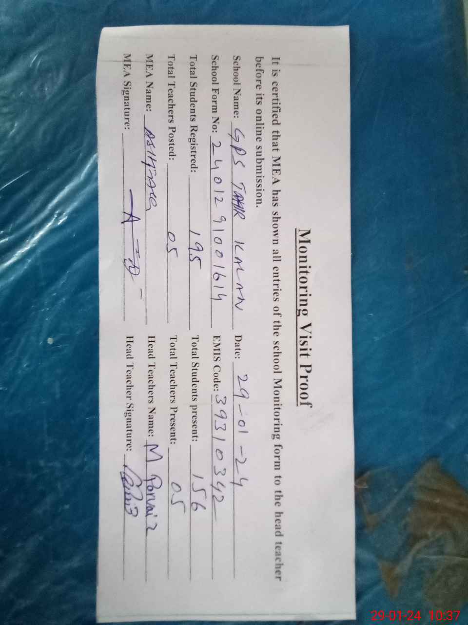 | Attendance Register | Head Teacher | MEA with School | Visit Proof |