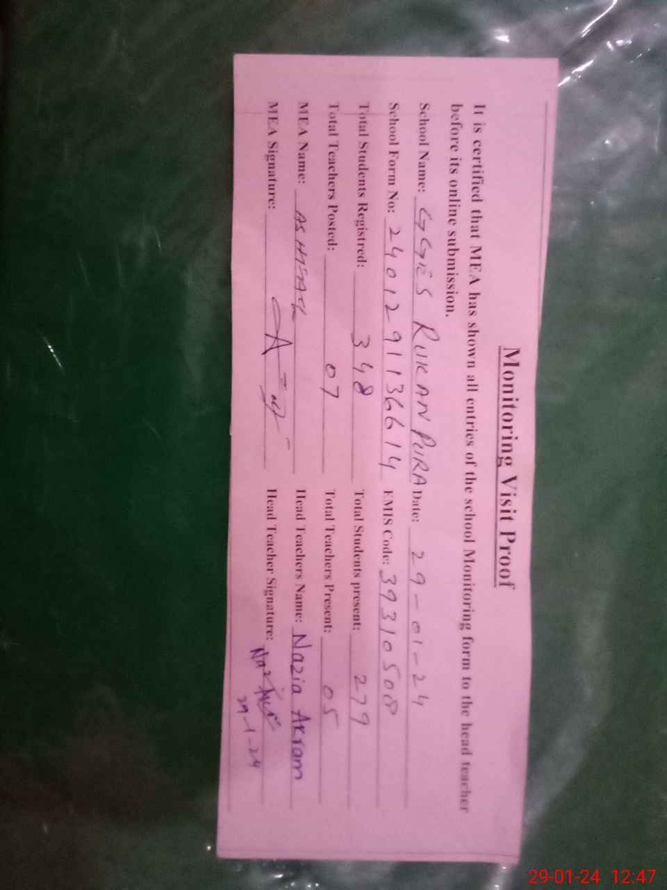 | Attendance Register | Head Teacher | MEA with School | Visit Proof |