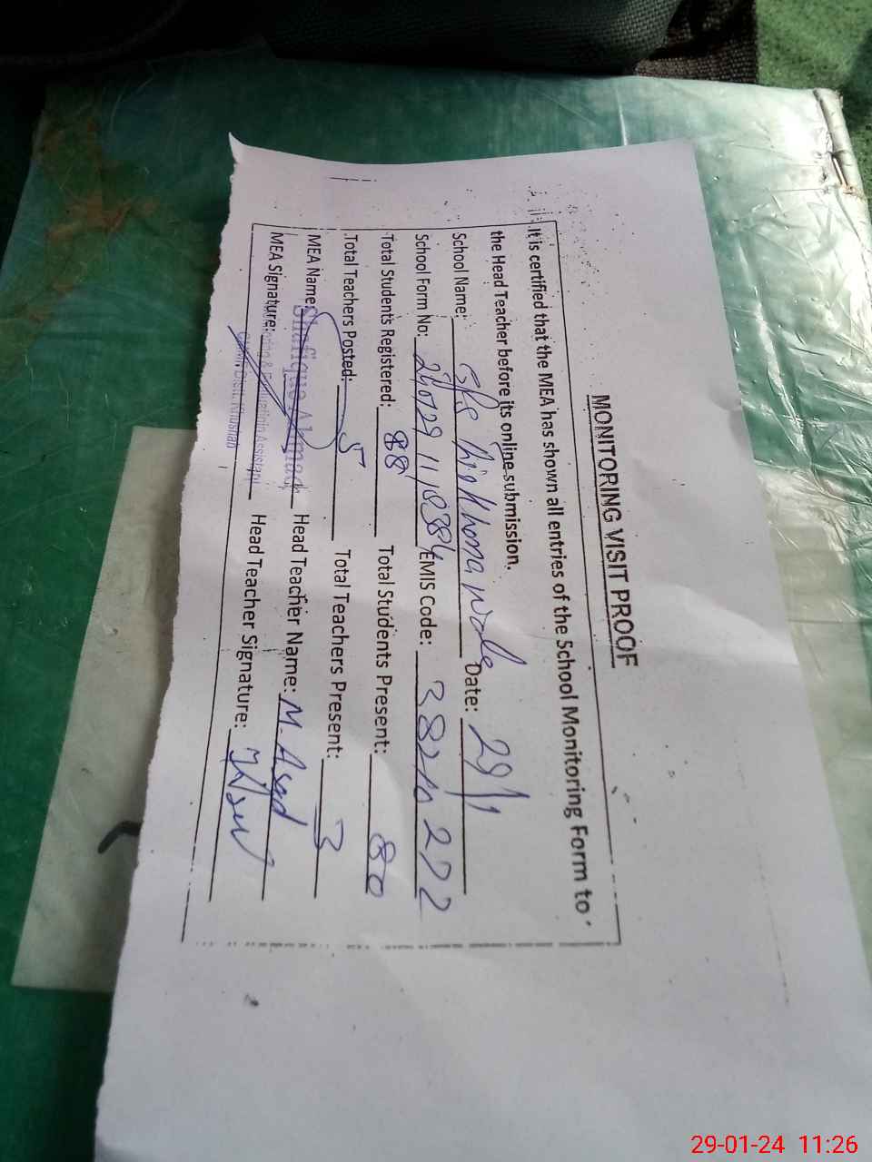 | Attendance Register | Head Teacher | MEA with School | Visit Proof |