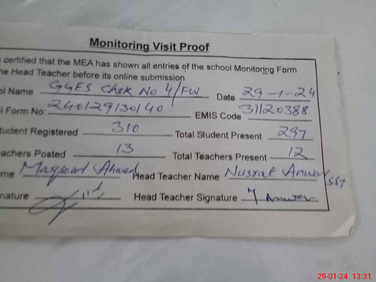 | EMIS Code: 31120388 | Name of School: GGES CHAK NO. 4/FW | |||