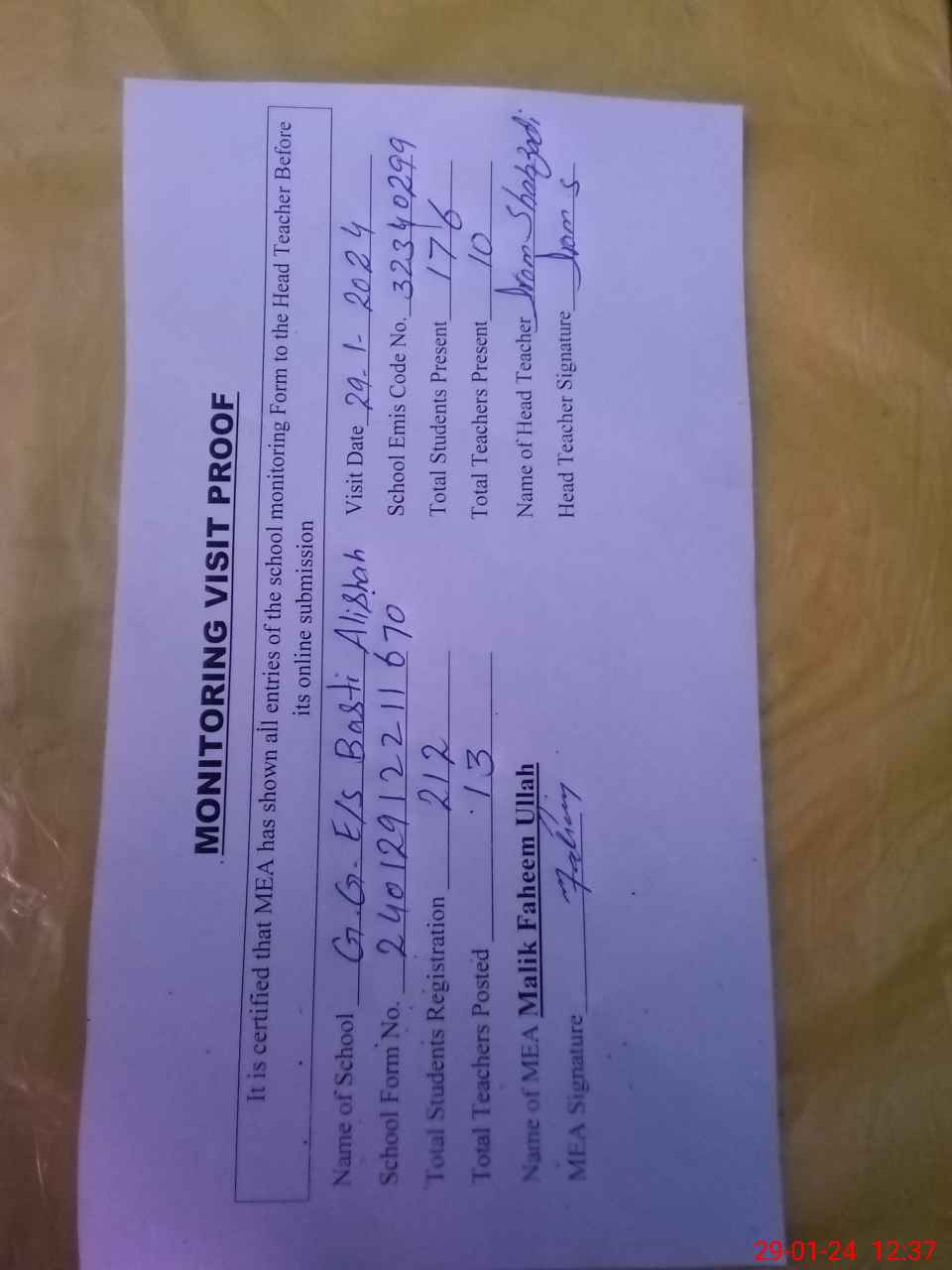 | Attendance Register | Head Teacher | MEA with School | Visit Proof |