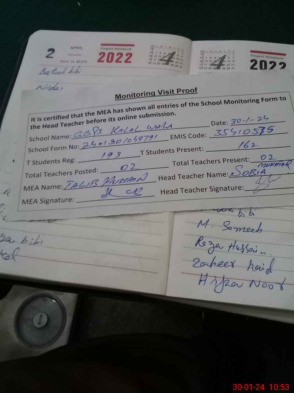 | Attendance Register | Head Teacher | MEA with School | Visit Proof |