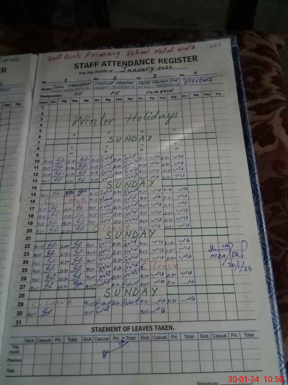 | CNIC | Full Name | Designation | R/C | Absence During Last Calender Month |