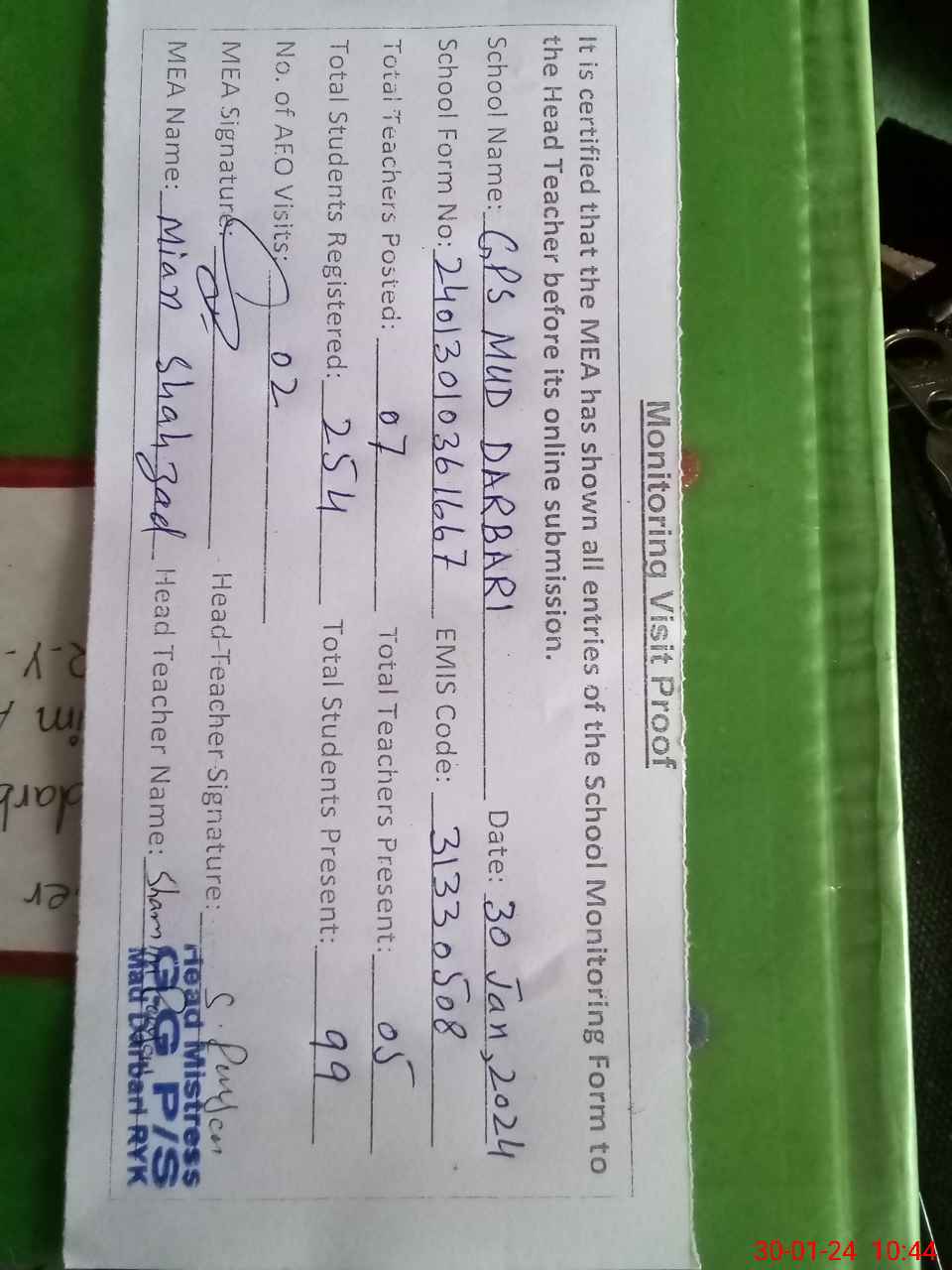 | Attendance Register | Head Teacher | MEA with School | Visit Proof |