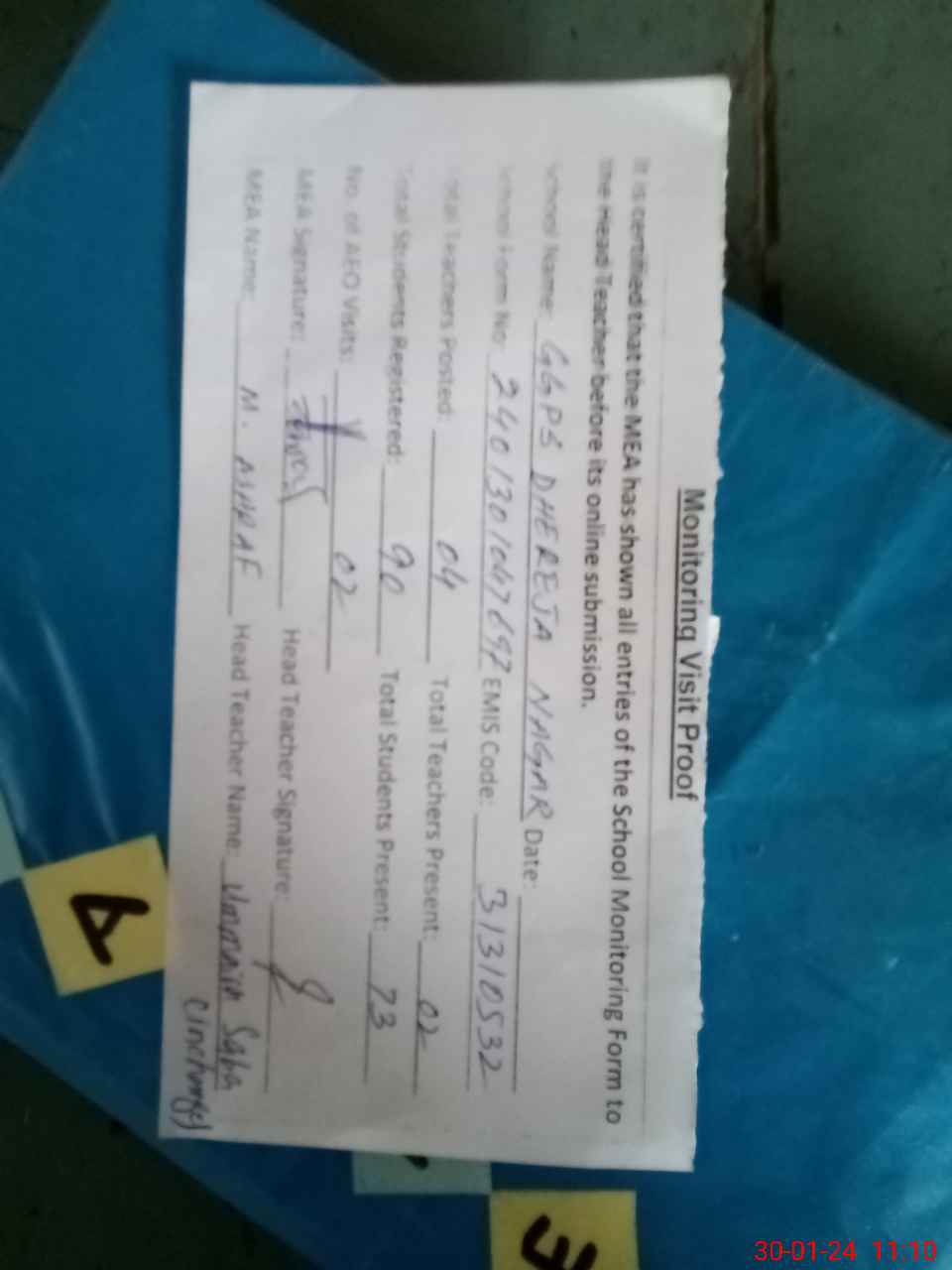 | Attendance Register | Head Teacher | MEA with School | Visit Proof |