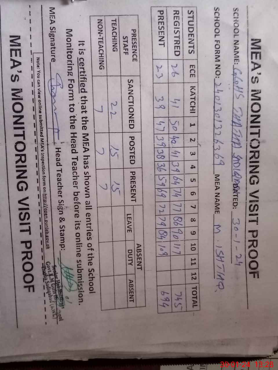 | Attendance Register | Head Teacher | MEA with School | Visit Proof |