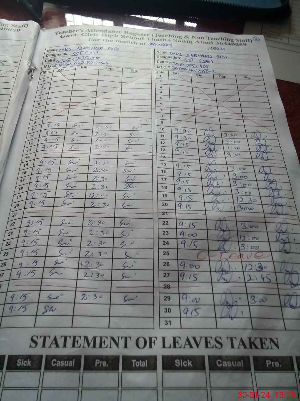 | CNIC | Full Name | Designation | R/C | Absence During Last Calender Month |