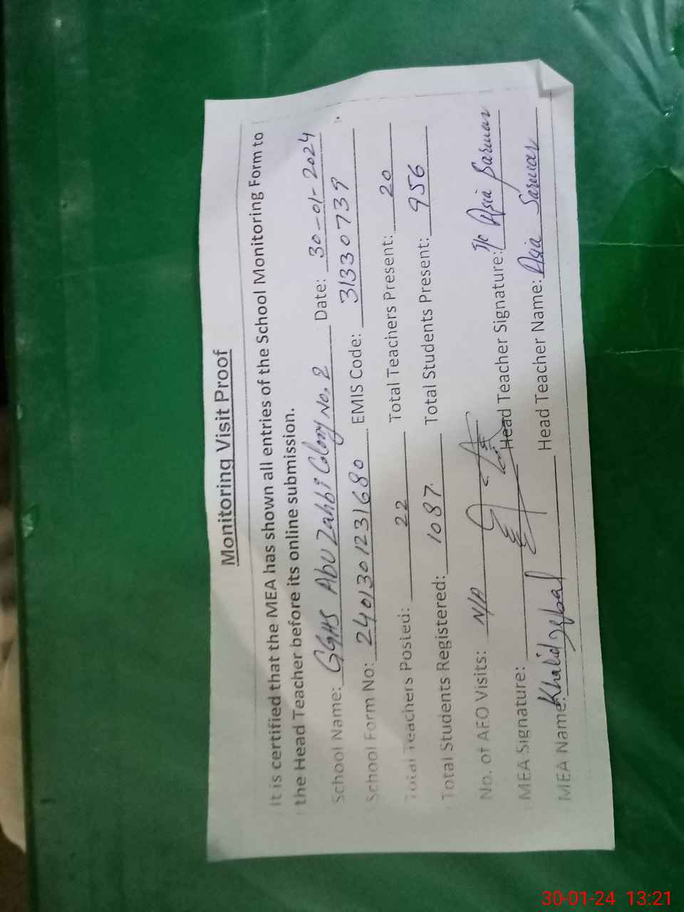 | Attendance Register | Head Teacher | MEA with School | Visit Proof |
