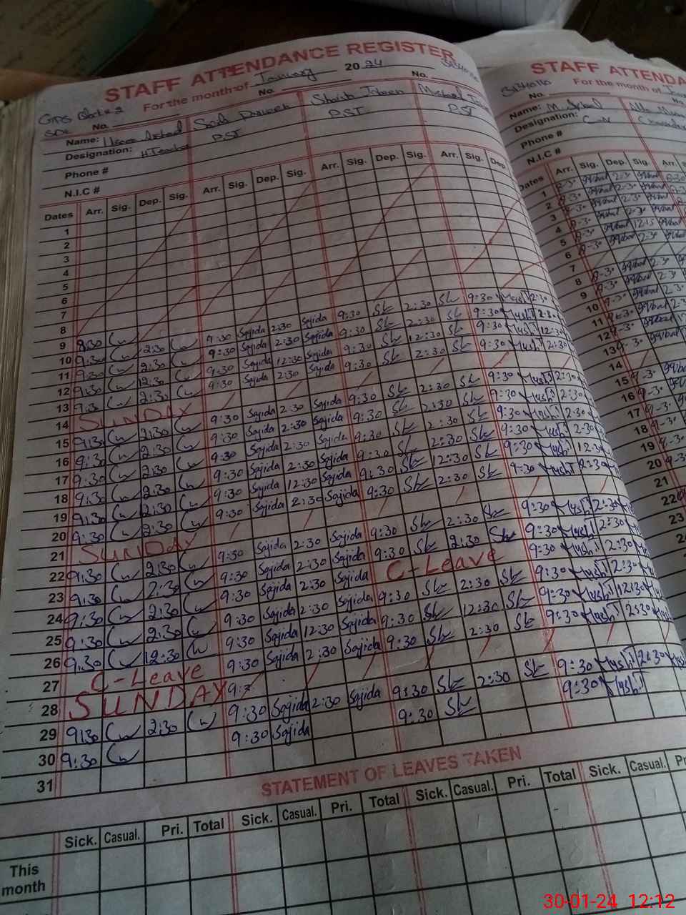 | CNIC | Full Name | Designation | R/C | Absence During Last Calender Month |