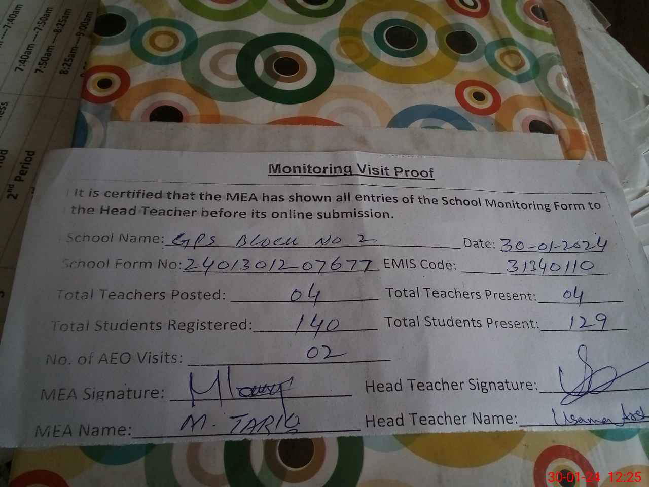 | Attendance Register | Head Teacher | MEA with School | Visit Proof |