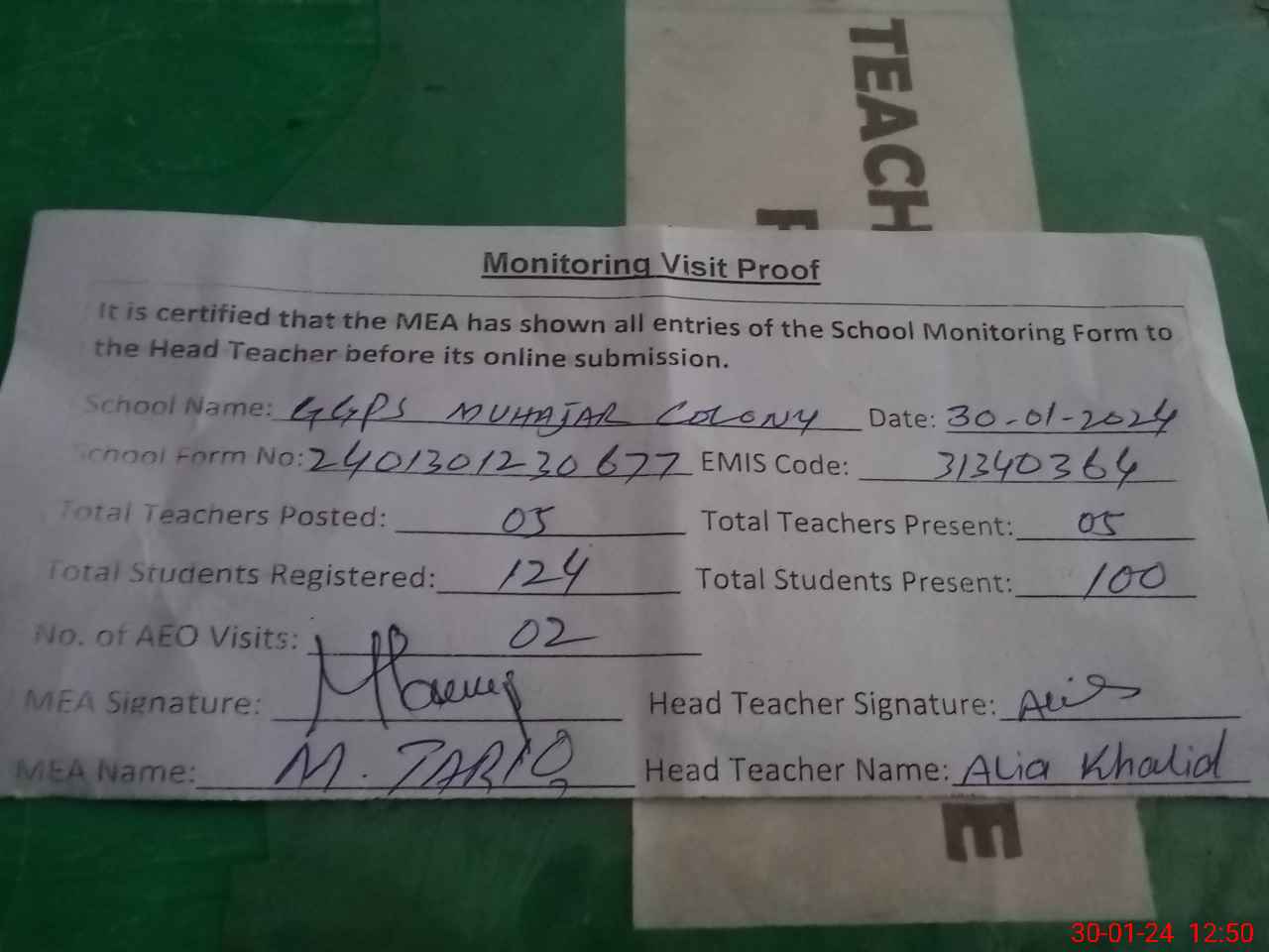 | Attendance Register | Head Teacher | MEA with School | Visit Proof |