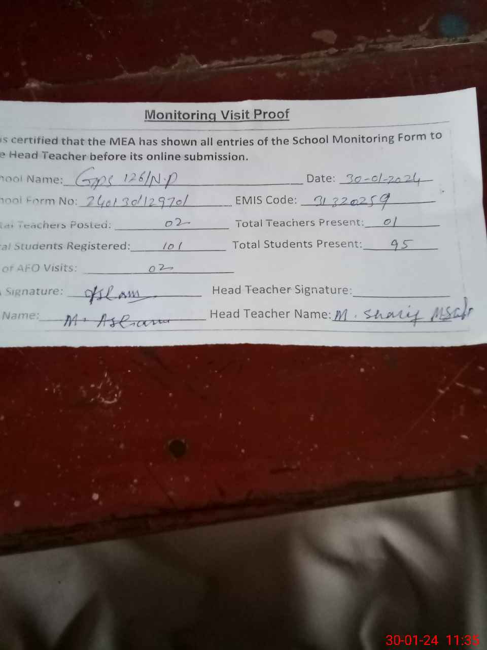 | Attendance Register | Head Teacher | MEA with School | Visit Proof |