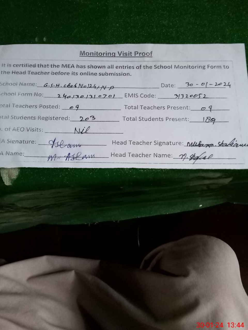 | Attendance Register | Head Teacher | MEA with School | Visit Proof |