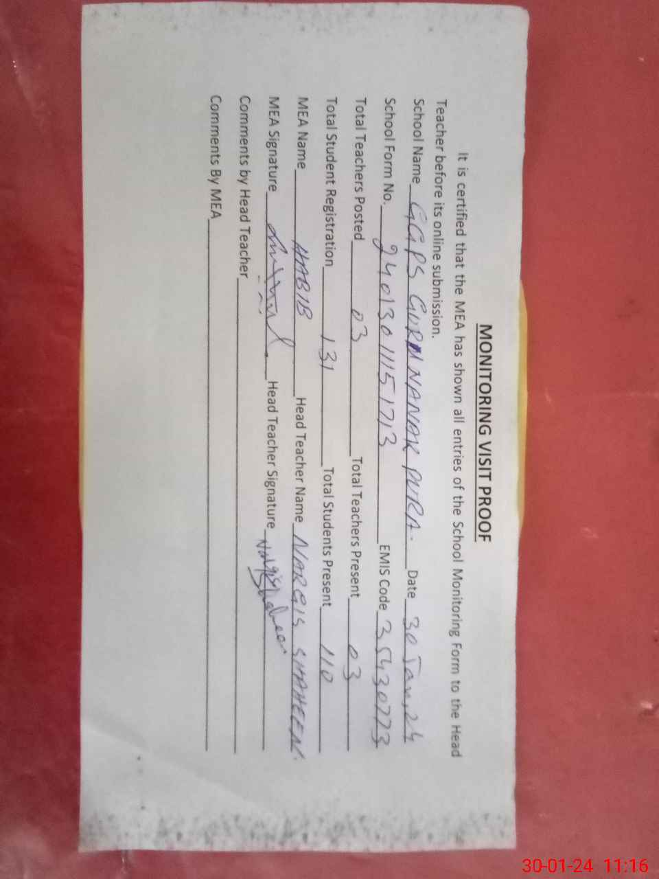| Attendance Register | Head Teacher | MEA with School | Visit Proof |