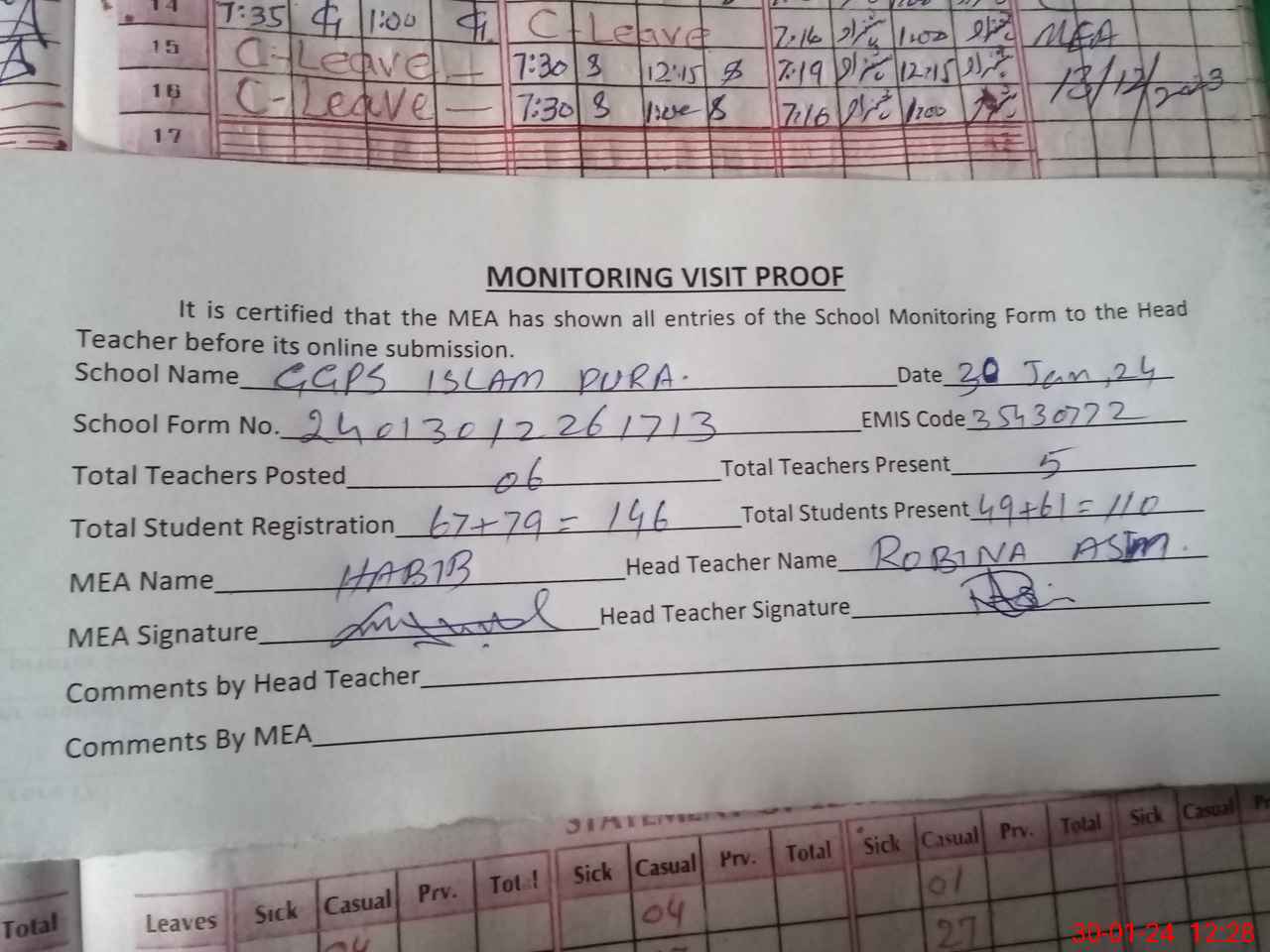 | Attendance Register | Head Teacher | MEA with School | Visit Proof |