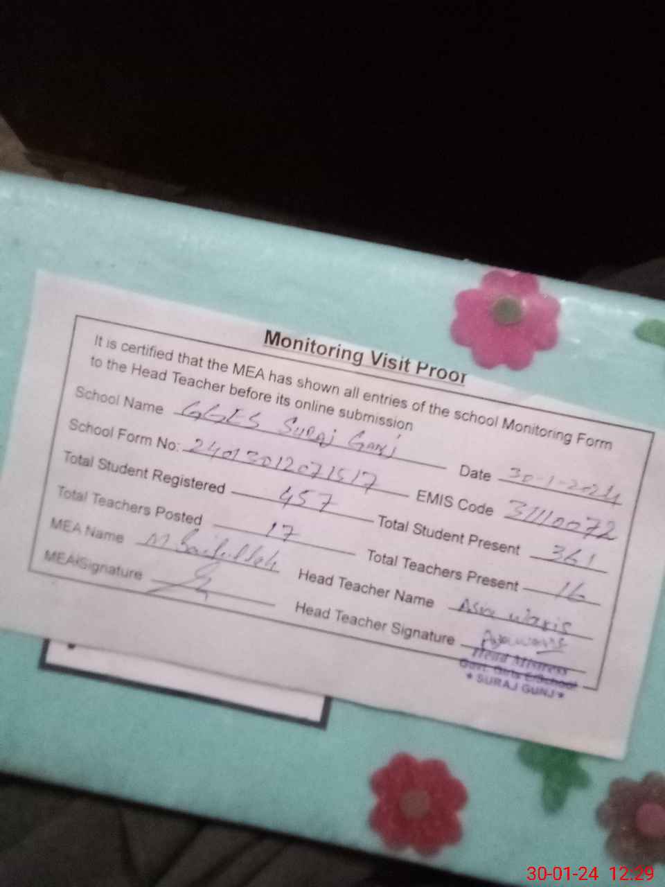 | Attendance Register | Head Teacher | MEA with School | Visit Proof |