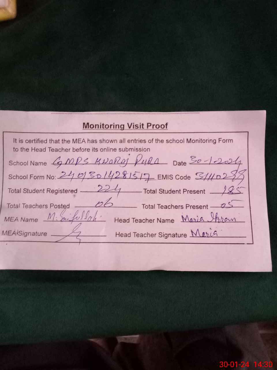 | EMIS Code: 31110299 | Name of School: GMPS KHARAJ PURA | |||