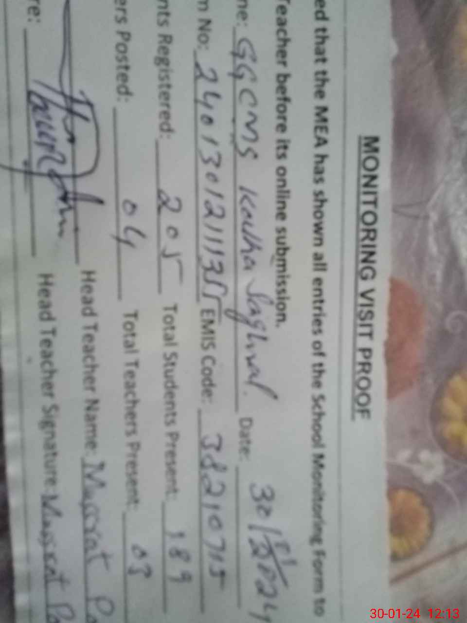 | Attendance Register | Head Teacher | MEA with School | Visit Proof |