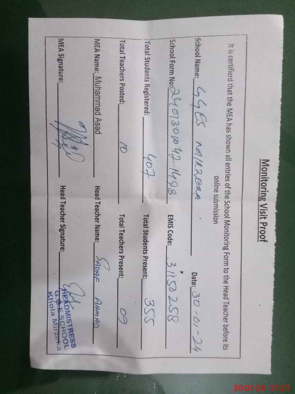| Certified that this School was Inspected by the Undersigned MEA/DMO Today and the Information Stated Above is as Per Record. | |||||
