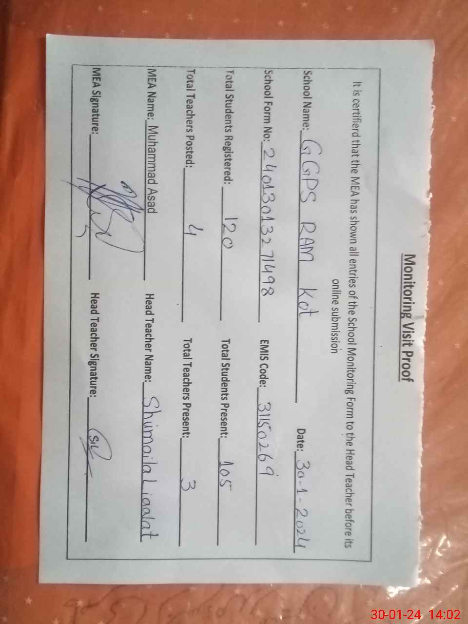 | Attendance Register | Head Teacher | MEA with School | Visit Proof |