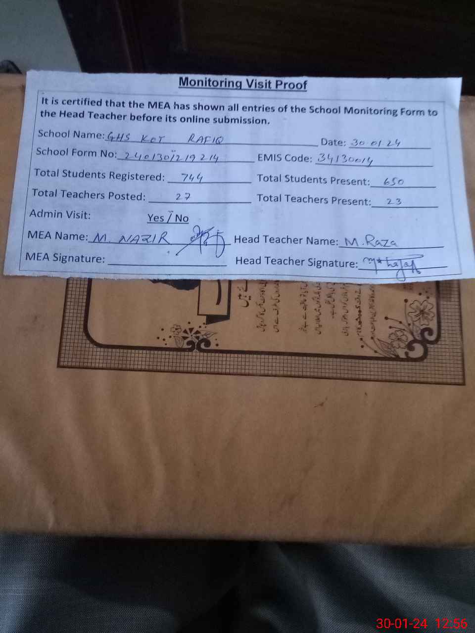 | Attendance Register | Head Teacher | MEA with School | Visit Proof |