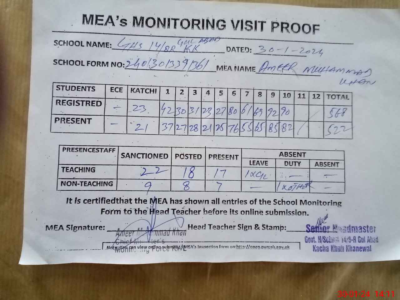| Attendance Register | Head Teacher | MEA with School | Visit Proof |