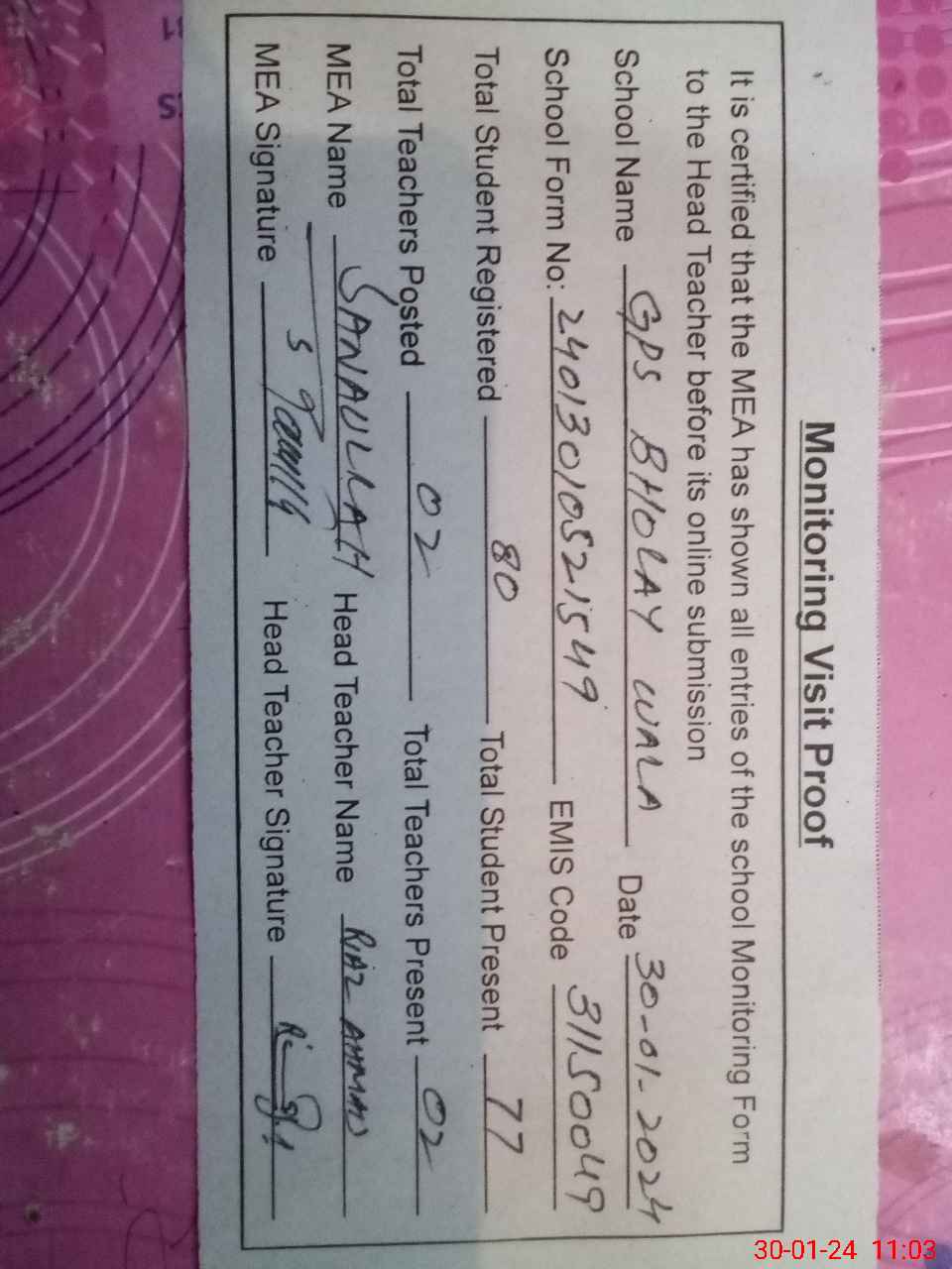 | Attendance Register | Head Teacher | MEA with School | Visit Proof |